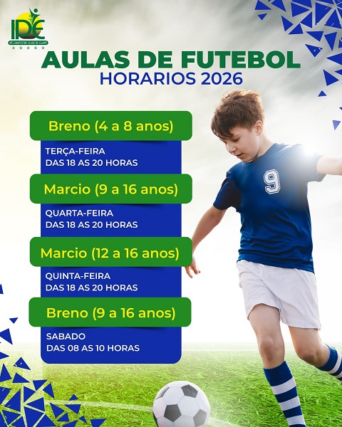 O Ipê Campestre Clube de Guapé tem o prazer de anunciar os horários das aulas de futebol para o
