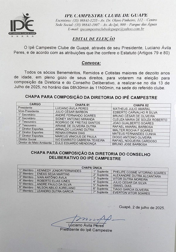 O Ipê Campestre Clube de Guapé, através de seu Presidente, Luciano Ávila Peres, e de acordo com as atribuições que lhe confere o Estatuto (Artigos 79 e 80)